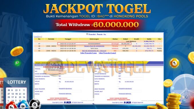 MEMBER DEWATOGEL MENERIMA PELUNASAN KEMENANGAN TOGEL HONGKONG POOLS RP 60.000.000,- LUNAS