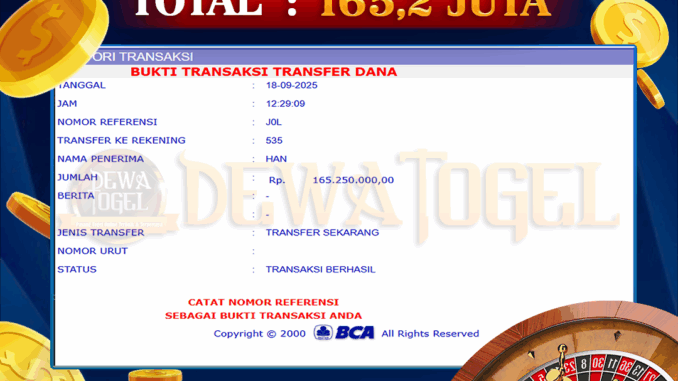 DEWATOGEL mengucapkan selamat kepada user id : NYA*** yang telah berhasil mendapatkan jackpot pada permainan LIVE CASINO DI DUEL DICE. Kemenangan sebesar Rp 165.250.000,-. telah dibayarkan LUNAS oleh pihak dewatogel kepada pemilik user id setelah yang bersangkutan mengisi formulir withdraw. Proses pencairan dana berlangsung sangat cepat hanya dalam waktu 5-10 menit sudah berada dalam rekening pemilik user id. Bukti transfer yang dapat anda lihat adalah bukti SAH / VALID yang langsung di dapatkan melalui bukti transaksi dari Bank yang digunakan untuk pengiriman dana pada rekening pemilik user id. Terima kasih kami sampaikan kepada para pengguna setia DEWATOGEL yang telah menggunakan situs kami, sebagai Bandar Terpercaya yang pastinya membayar semua kemenangan member hingga lunas. Apakah DEWATOGEL PENIPU ? Reputasi “DEWATOGEL TERPERCAYA” sudah sangat melekat. puluhan hingga ratusan ribu pengguna setia DEWATOGEL tetap menggunakan situs terbesar dan terbaik di Indonesia ini. Hapus rasa was-was dan khawatir anda, kemenangan anda berapapun PASTI dibayarkan hingga lunas.