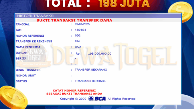 DEWATOGEL mengucapkan selamat kepada user id : SBN*** yang telah berhasil mendapatkan jackpot pada permainan LIVE CASINO DI FANTAN. Kemenangan sebesar Rp 120.500.000,-. telah dibayarkan LUNAS oleh pihak dewatogel kepada pemilik user id setelah yang bersangkutan mengisi formulir withdraw. Proses pencairan dana berlangsung sangat cepat hanya dalam waktu 5-10 menit sudah berada dalam rekening pemilik user id. Bukti transfer yang dapat anda lihat adalah bukti SAH / VALID yang langsung di dapatkan melalui bukti transaksi dari Bank yang digunakan untuk pengiriman dana pada rekening pemilik user id. Terima kasih kami sampaikan kepada para pengguna setia DEWATOGEL yang telah menggunakan situs kami, sebagai Bandar Terpercaya yang pastinya membayar semua kemenangan member hingga lunas. Apakah DEWATOGEL PENIPU ? Reputasi “DEWATOGEL TERPERCAYA” sudah sangat melekat. puluhan hingga ratusan ribu pengguna setia DEWATOGEL tetap menggunakan situs terbesar dan terbaik di Indonesia ini. Hapus rasa was-was dan khawatir anda, kemenangan anda berapapun PASTI dibayarkan hingga lunas.